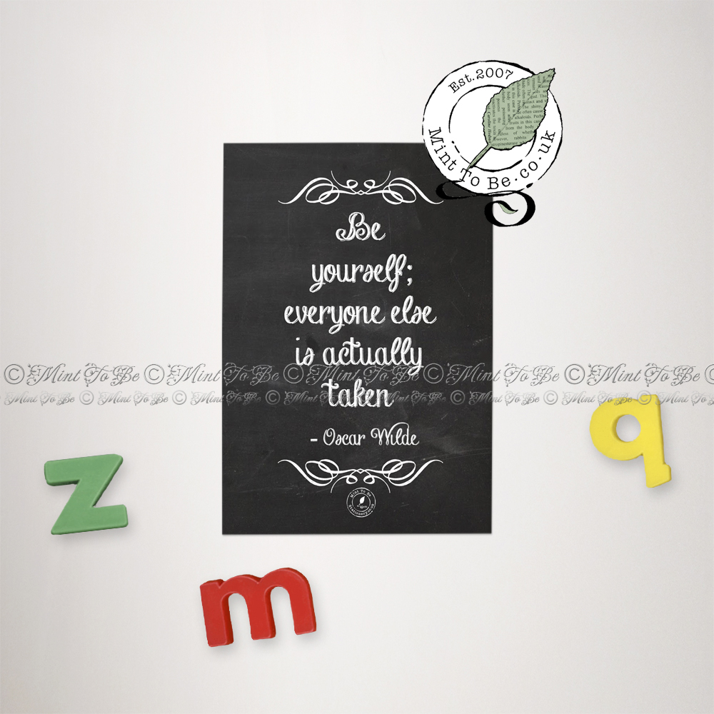 This is a digital artwork using words from Oscar Wilde and a photograph of a dusty black chalkboard, taken when I was teaching.