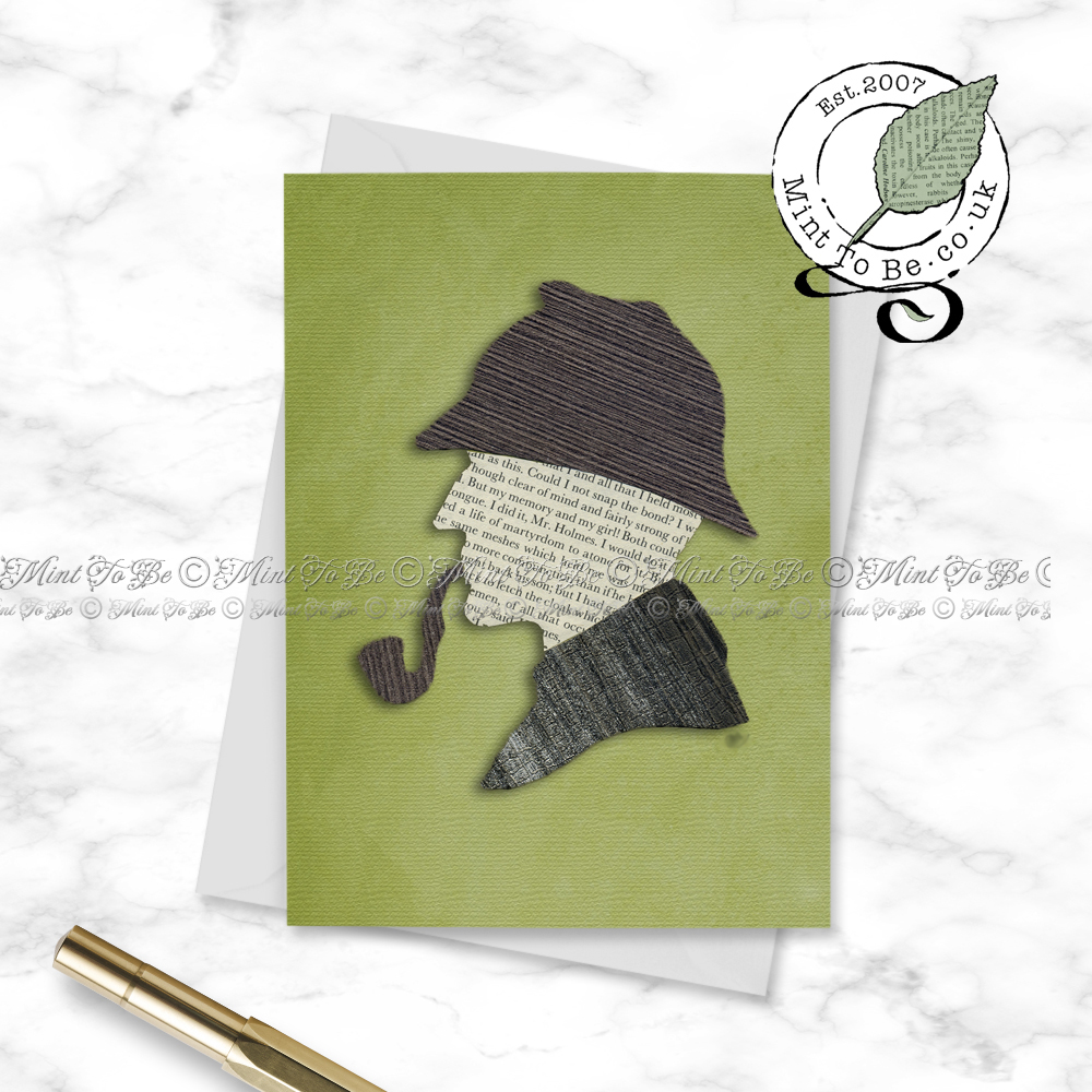 A greetings card created from one of my original recycled and textured inlaid paper marquetry pieces depicting the profile of Sherlock Holmes and accented by recycling part of a page from a Sherlock Holmes book that was falling apart.