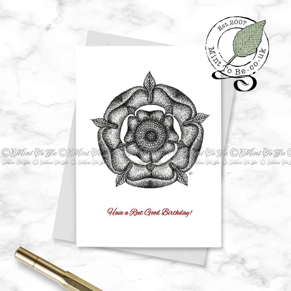 A greetings card created from one of my original dip pen and ink stippled dot pieces featuring a black and white Lancashire rose.