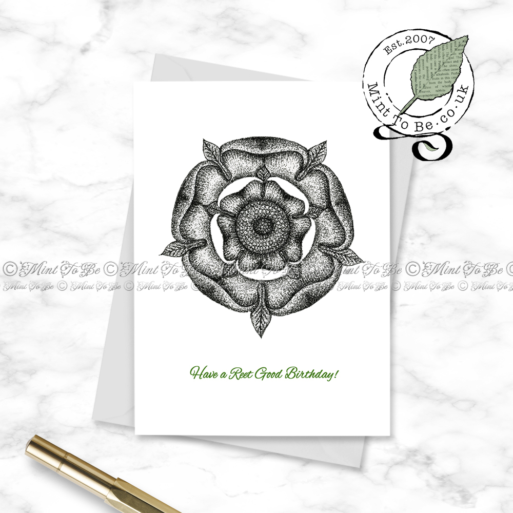 A greetings card created from one of my original dip pen and ink stippled dot pieces featuring a black and white Yorkshire rose.