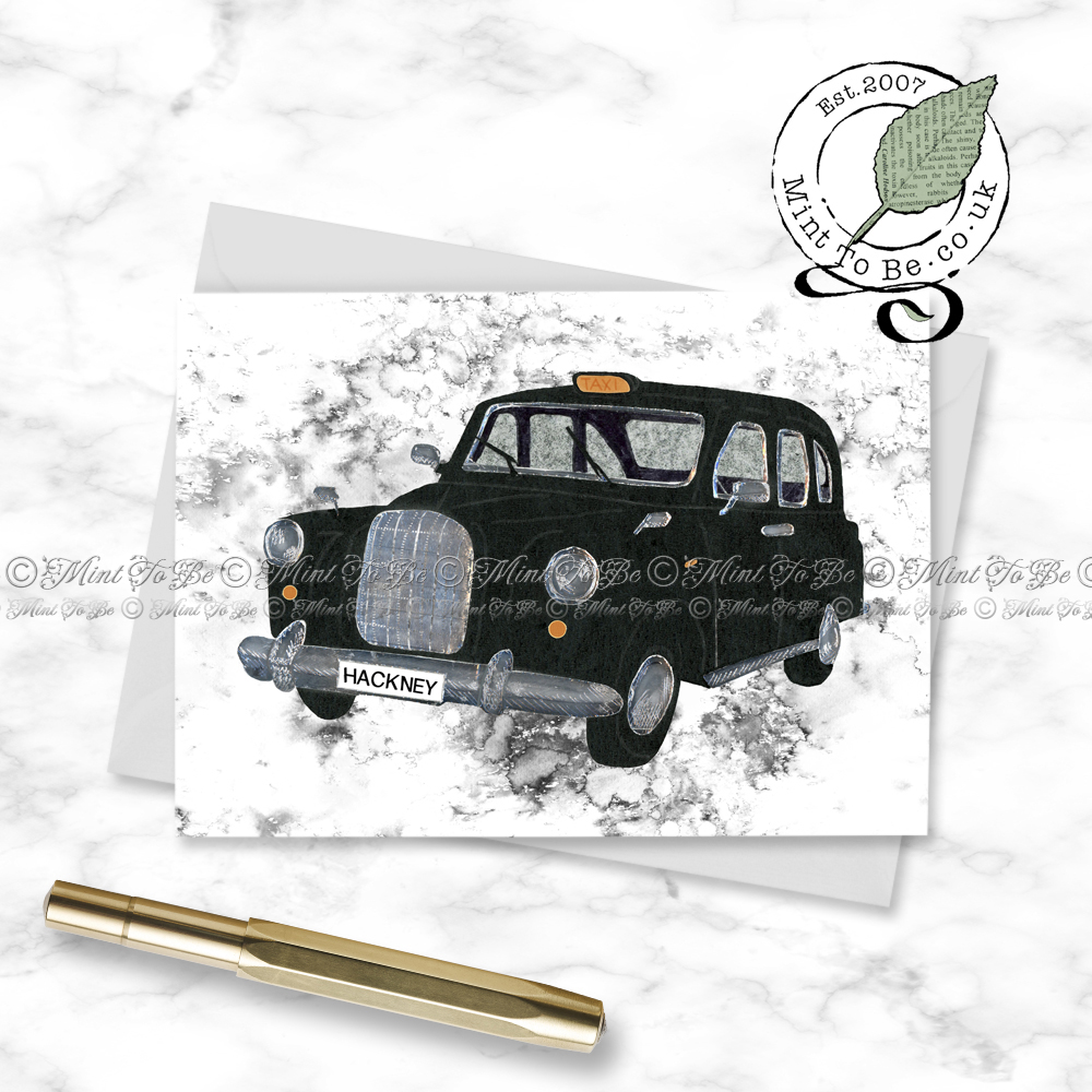A greetings card created from one of my original recycled and textured inlaid paper marquetry pieces featuring a black cab on the streets of London.