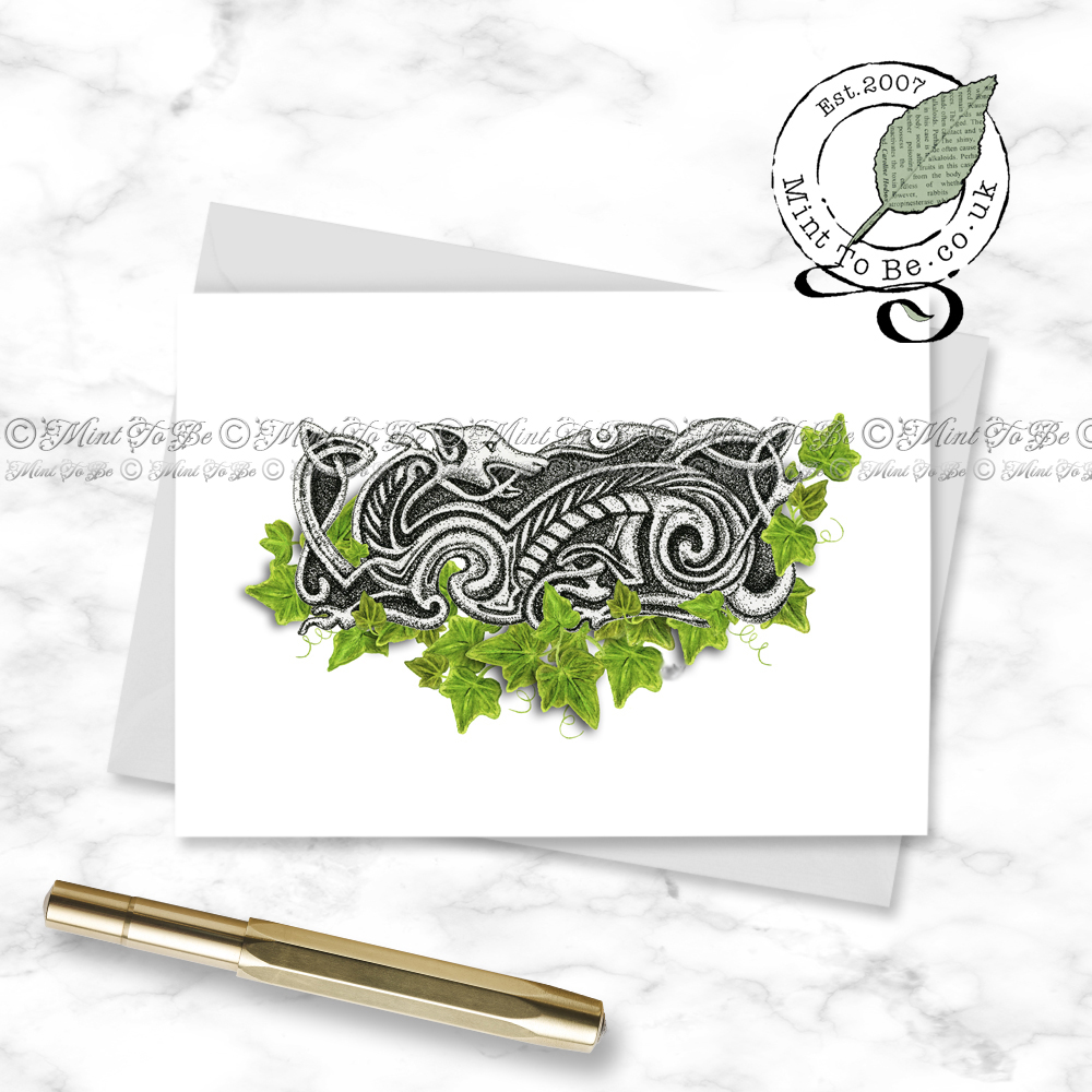 Thousands of tiny acrylic ink dots, drawn using a vintage dip pen, have been spaced out or layered up to create the depth of the intertwining knot work of this Book of Kells-inspired Celtic Dog, whilst boughs of vibrant watercolour pencil green variegated ivy leaves trail over it as a nod to nature reclaiming the manmade stone carving as its own.