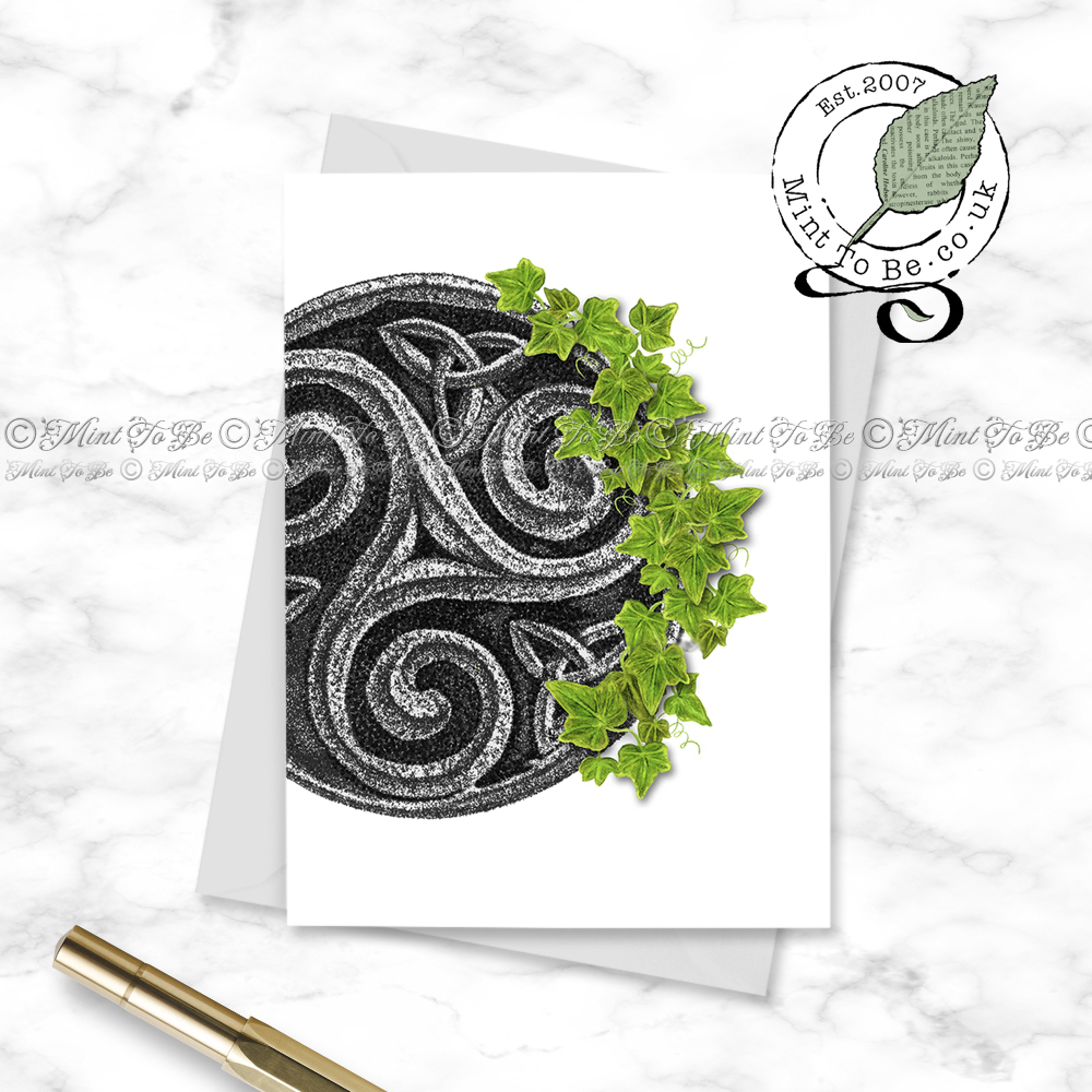 A greetings card created from one of my original original dip pen and ink stippled dot with watercolour pencil pieces featuring a Celtic Triskele and Triquetra (Trinity) knot seen in Ireland.