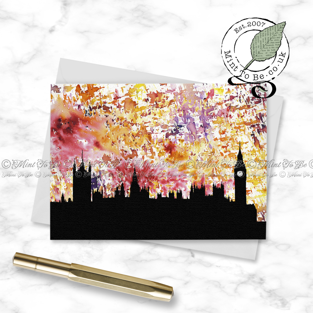 A greetings card created from one of my original mixed media pieces featuring a hand paper cut silhouette of London’s infamous Big Ben and Houses of Parliament laid over watercolour ink New Year 'fireworks'.