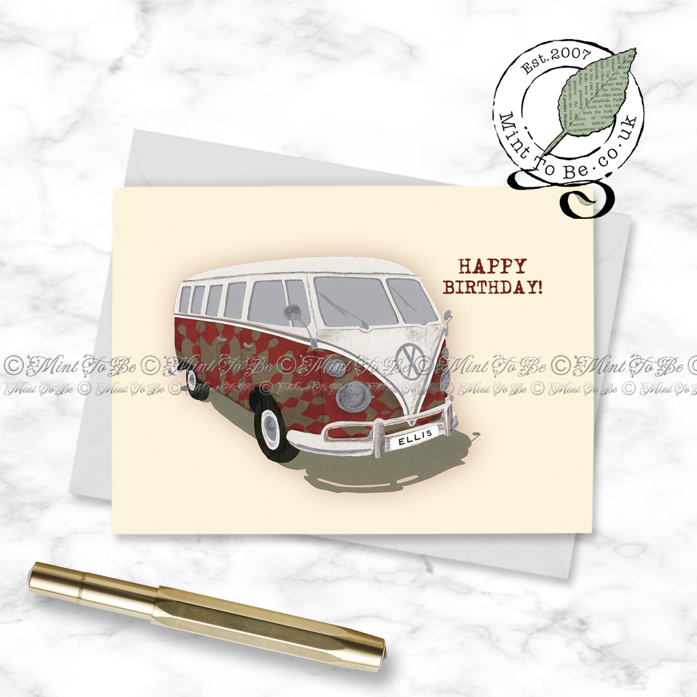 A greetings card created from one of my original recycled and textured inlaid paper marquetry pieces featuring a restored campervan spotted in the USA.