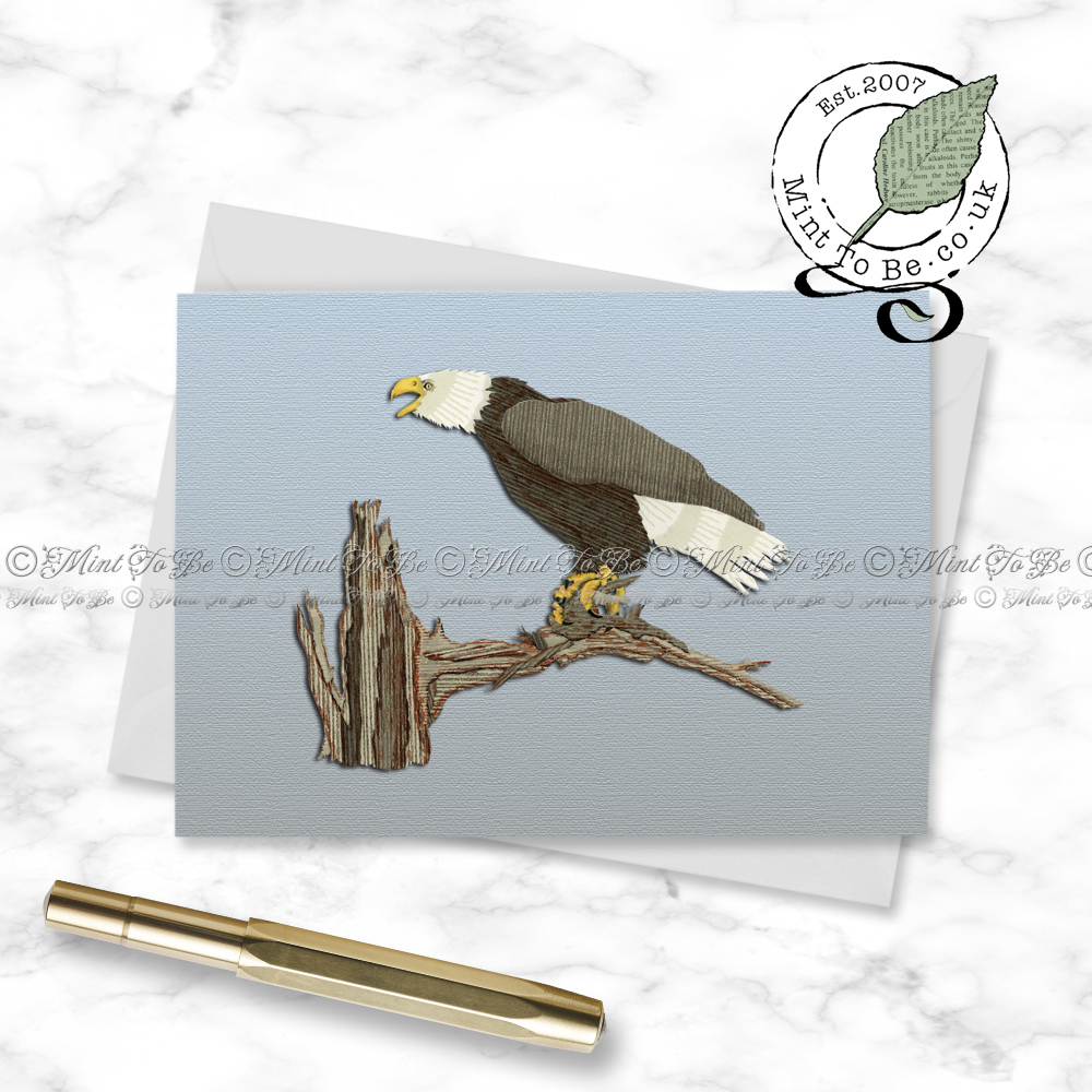 A greetings card created from one of my original recycled and textured inlaid paper marquetry pieces featuring a bald eagle spotted in Alaska, USA.