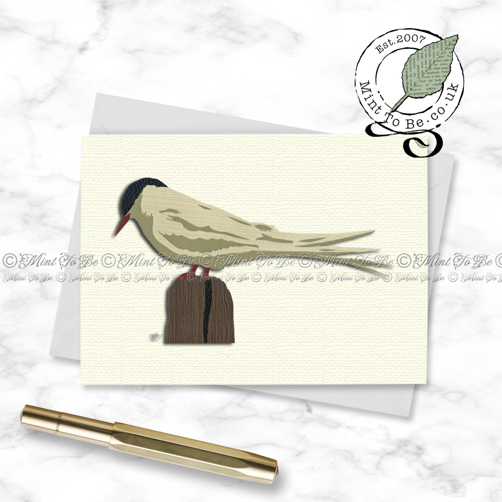 A greetings card created from one of my original recycled and textured inlaid paper marquetry pieces featuring an Arctic tern spotted in Alaska, USA.