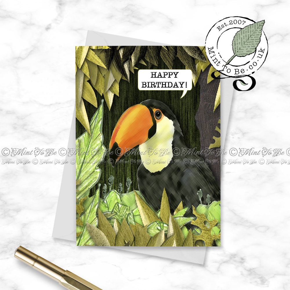 A greetings card created from one of my original mixed media pieces featuring a toucan seen in Singapore.