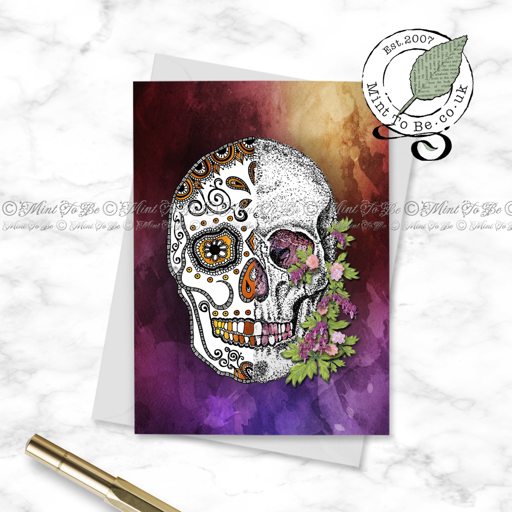 A greetings card created from one of my original dip pen and ink, watercolour pencil and vibrant acrylic ink drawings featuring a sugar skull. This was one of two pieces done in the third year of what has now become a collectible annual series.