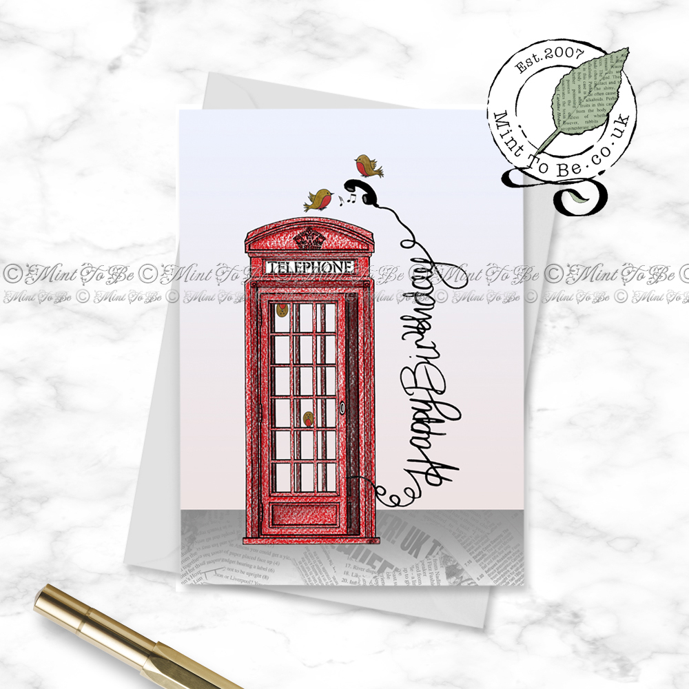 A greetings card created from one of my original mixed media pieces featuring a traditional red telephone box in London, which was originally created using dip pen and ink, watercolour pencil and newspaper cuttings. The cheeky little robins say, 'Happy Birthday'.