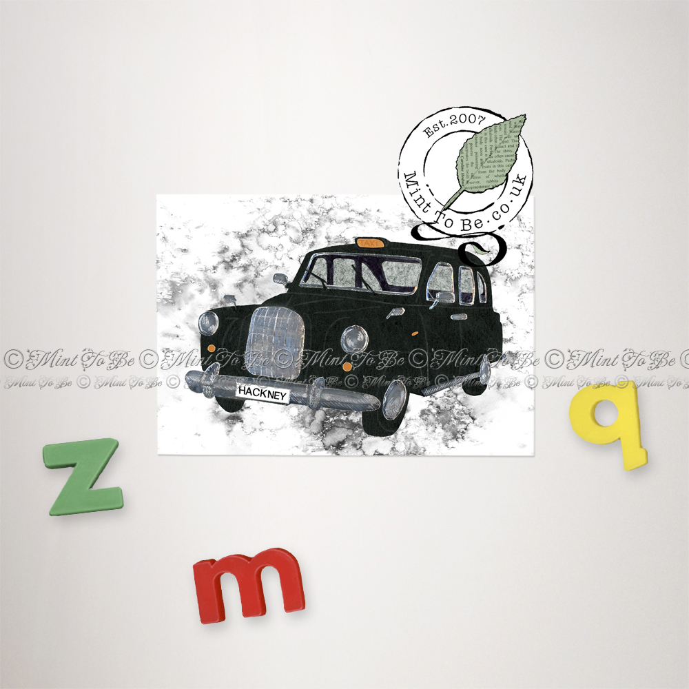 This artwork has been created from one of my original recycled and textured inlaid paper marquetry pieces featuring a London Hackney taxi cab, set into an acrylic ink diffused background, emulating the greys of the splashed puddles on the city streets of London and skies above.