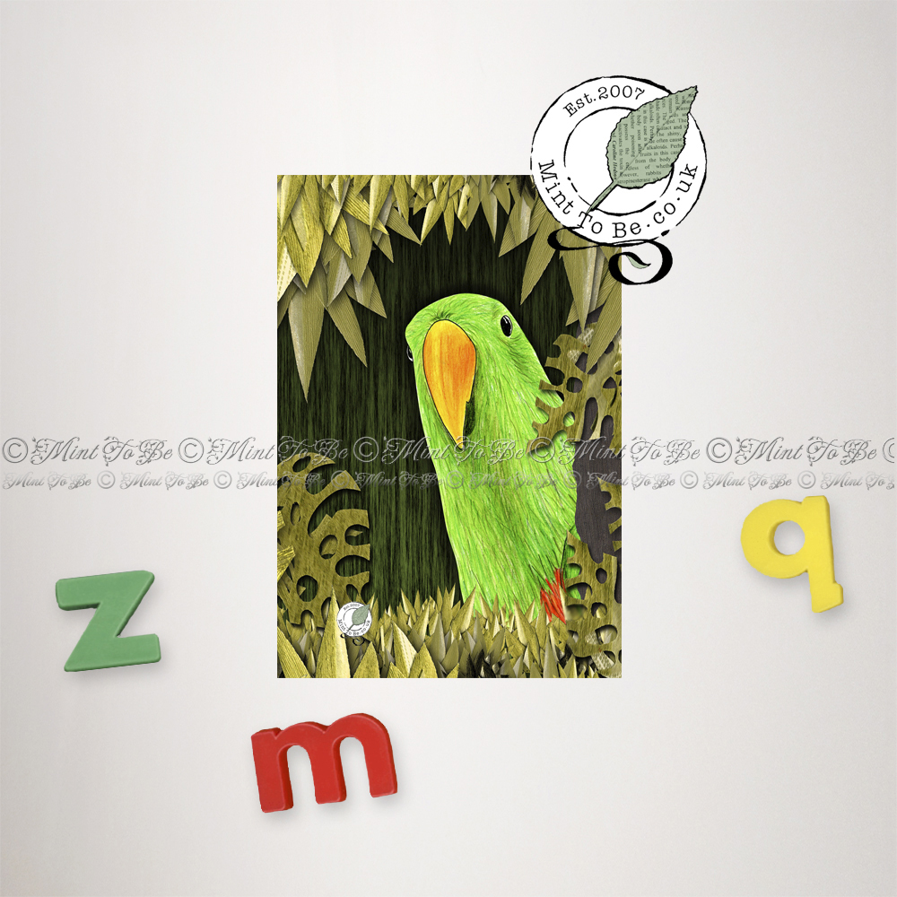 To recreate this cheeky chappie, I’ve drawn him in vibrant, watercolour pencil and collaged him within the leafy rainforest, the layers of leaves cut from lovely textured, recycled papers.