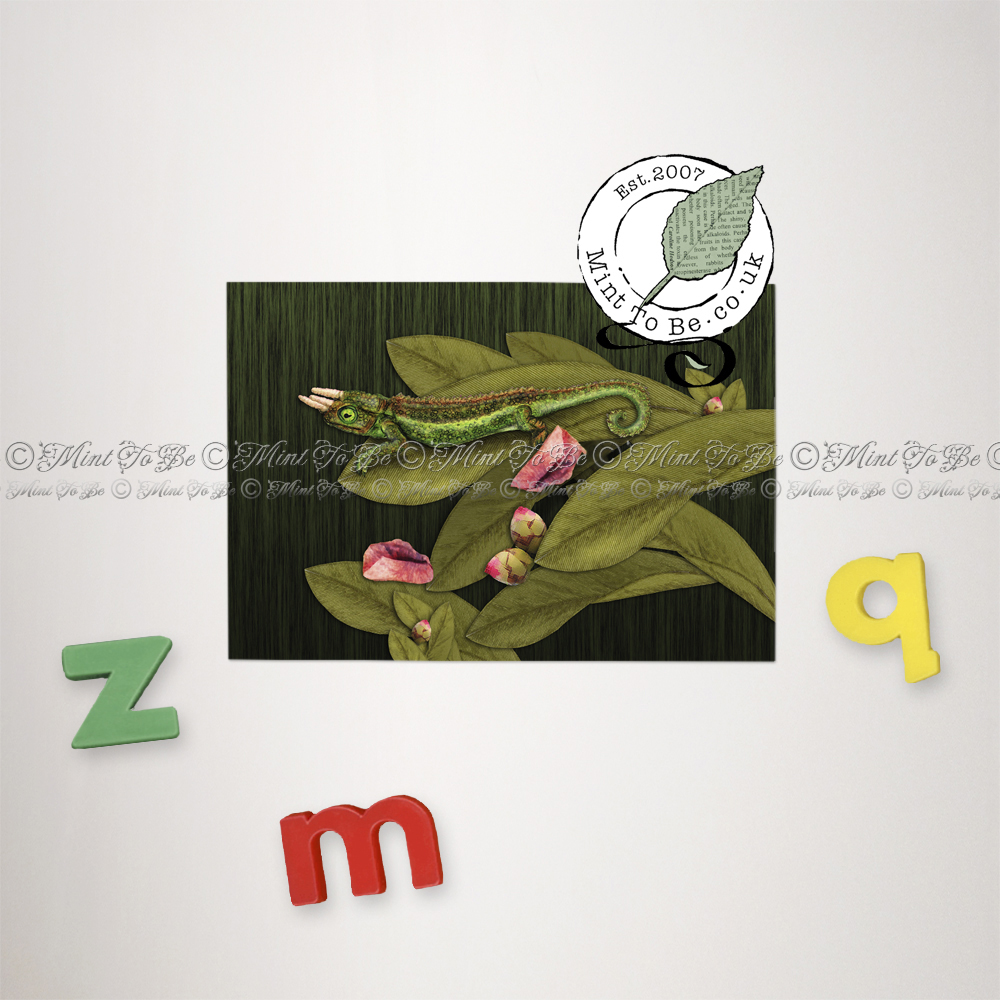 Artify your fridge, metal filing cabinets or magnetic notice boards with this slimline, flexible art magnet, reproduced from a miniaturisation of one of my mixed media pieces featuring a three-horned Jackson's chameleon spotted in Hawai'i, USA.