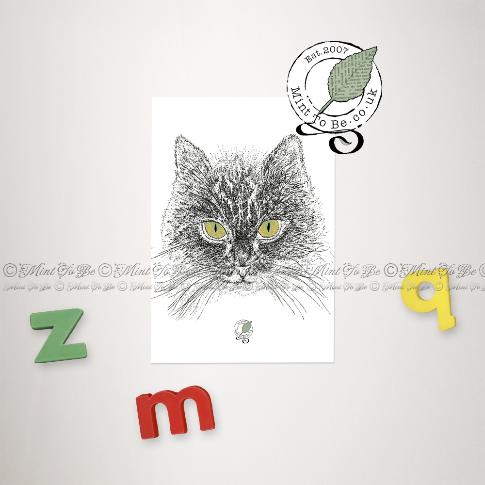 Artify your fridge, metal filing cabinets or magnetic notice boards with this slimline, flexible art magnet, reproduced from a miniaturisation of one of my original dip pen and ink stippled dot pieces featuring the face of a cat.