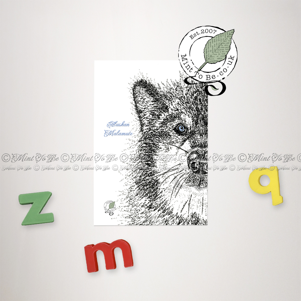 Artify your fridge, metal filing cabinets or magnetic notice boards with this slimline, flexible art magnet, reproduced from a miniaturisation of one of my original dip pen and ink stippled dot pieces featuring the face of a Malamute with piercing blue eyes, seen in Alaska, USA.