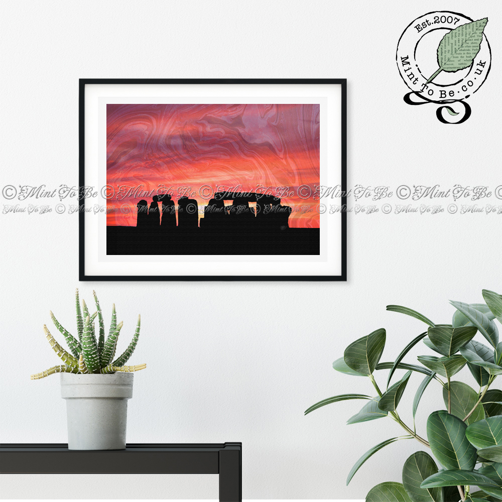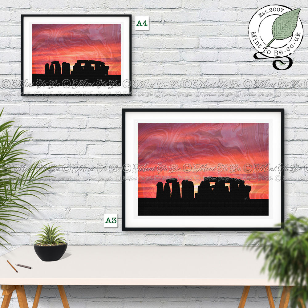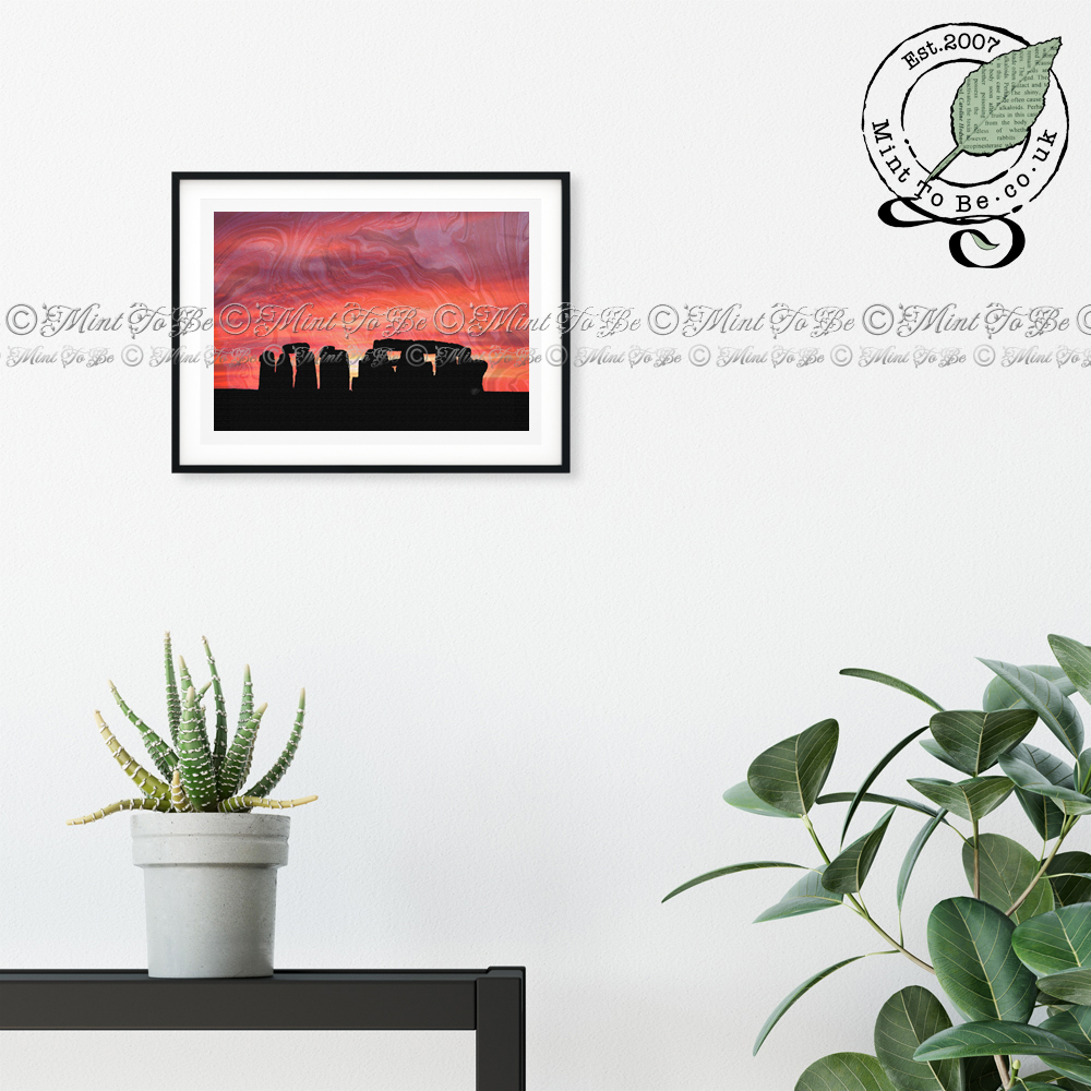 Add colour and interest to your favourite room with this striking art print featuring a papercut silhouette of Stonehenge set against a sky saturated with swirling rich red and pink hues.