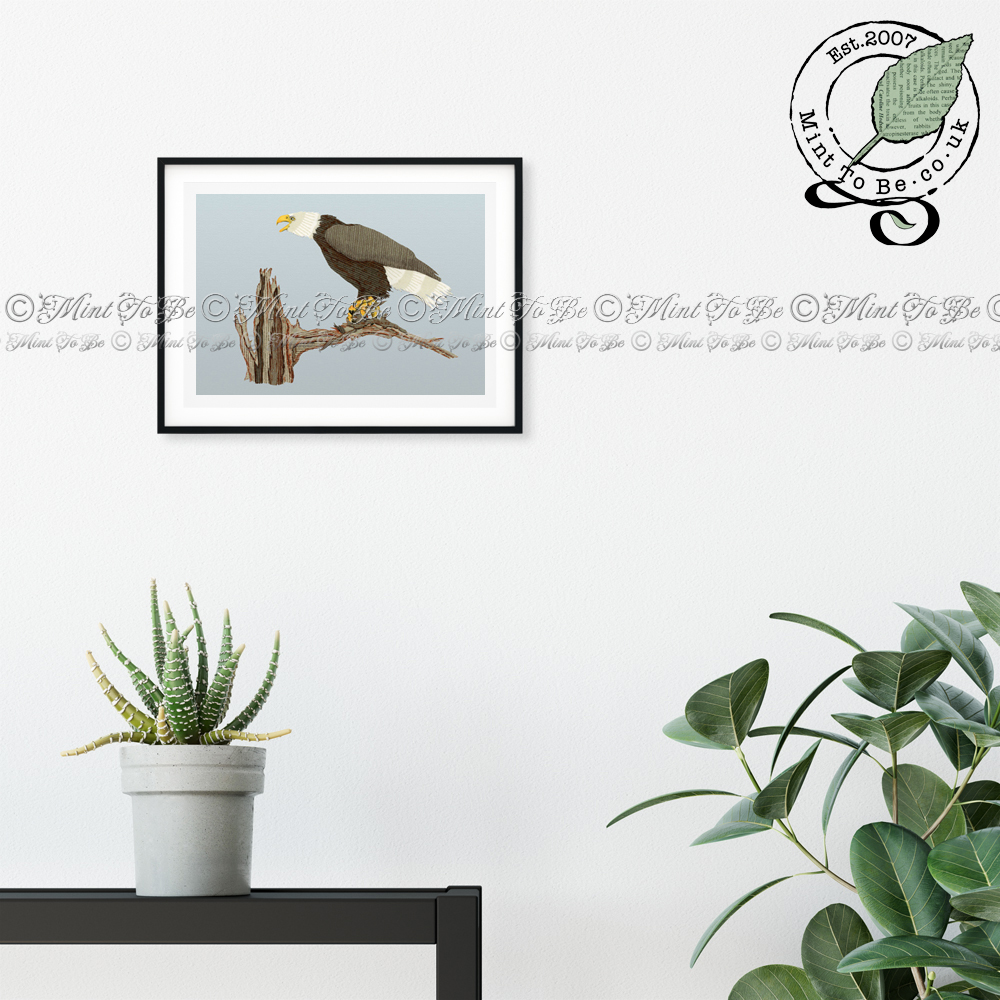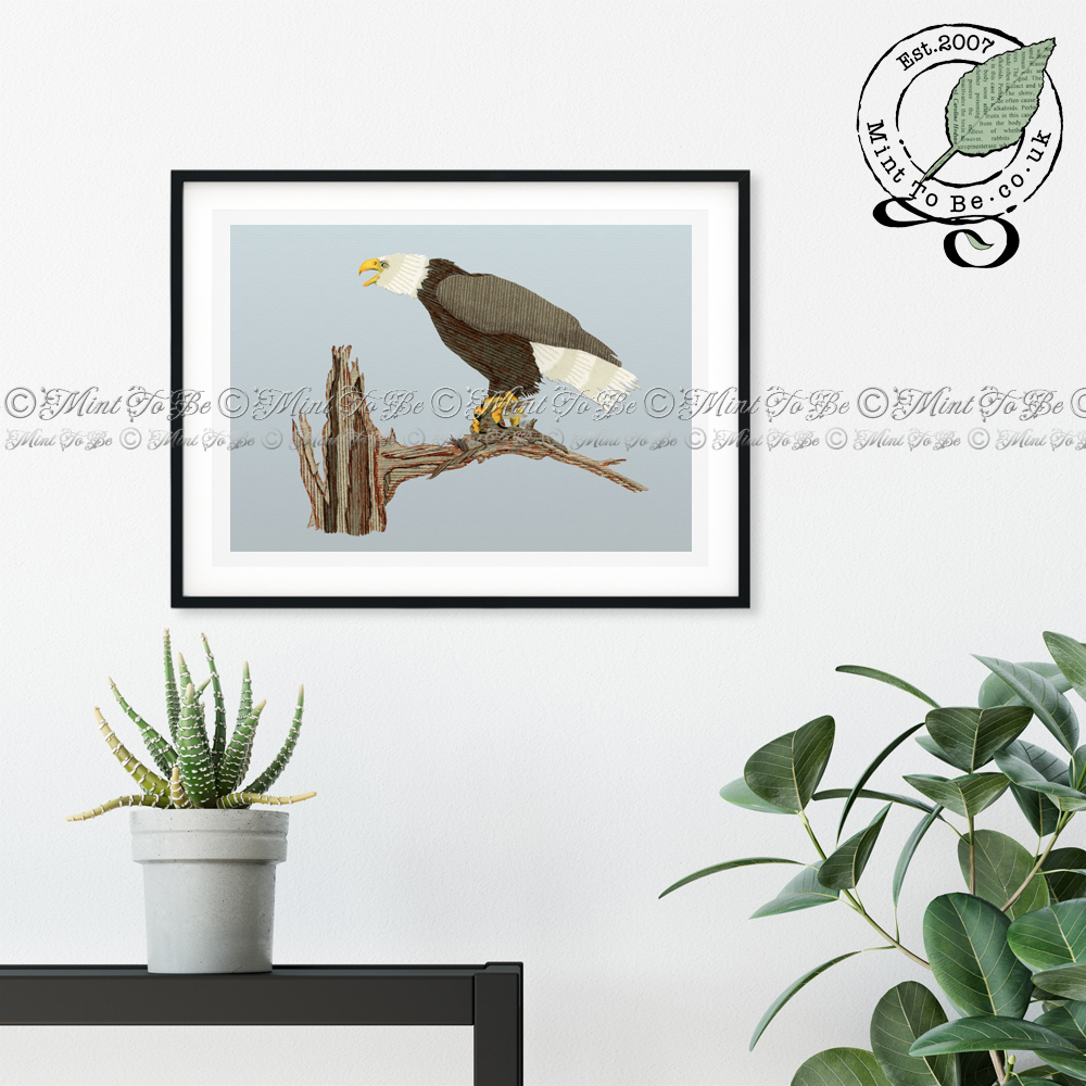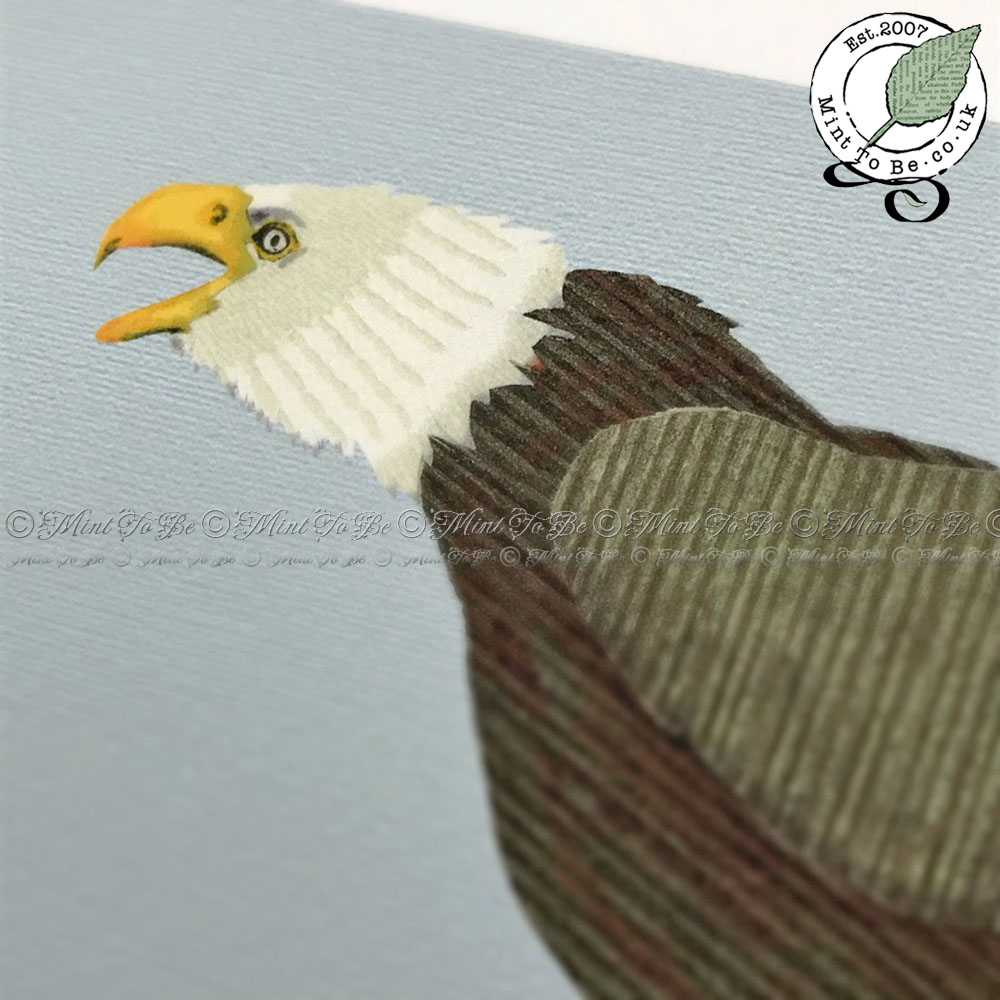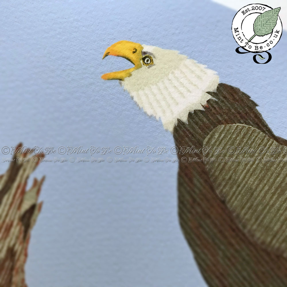 Add a striking focal point to your room that is sure to be talked about with the raw emotion captured in this art print featuring a bald eagle in the harsh Alaskan landscape, moments after its lunch of fresh salmon had been stolen from its talons. Originally created using carefully selected, recycled, textured papers, which were carefully cut and painstakingly inlaid by hand to give a lifelike impression.
