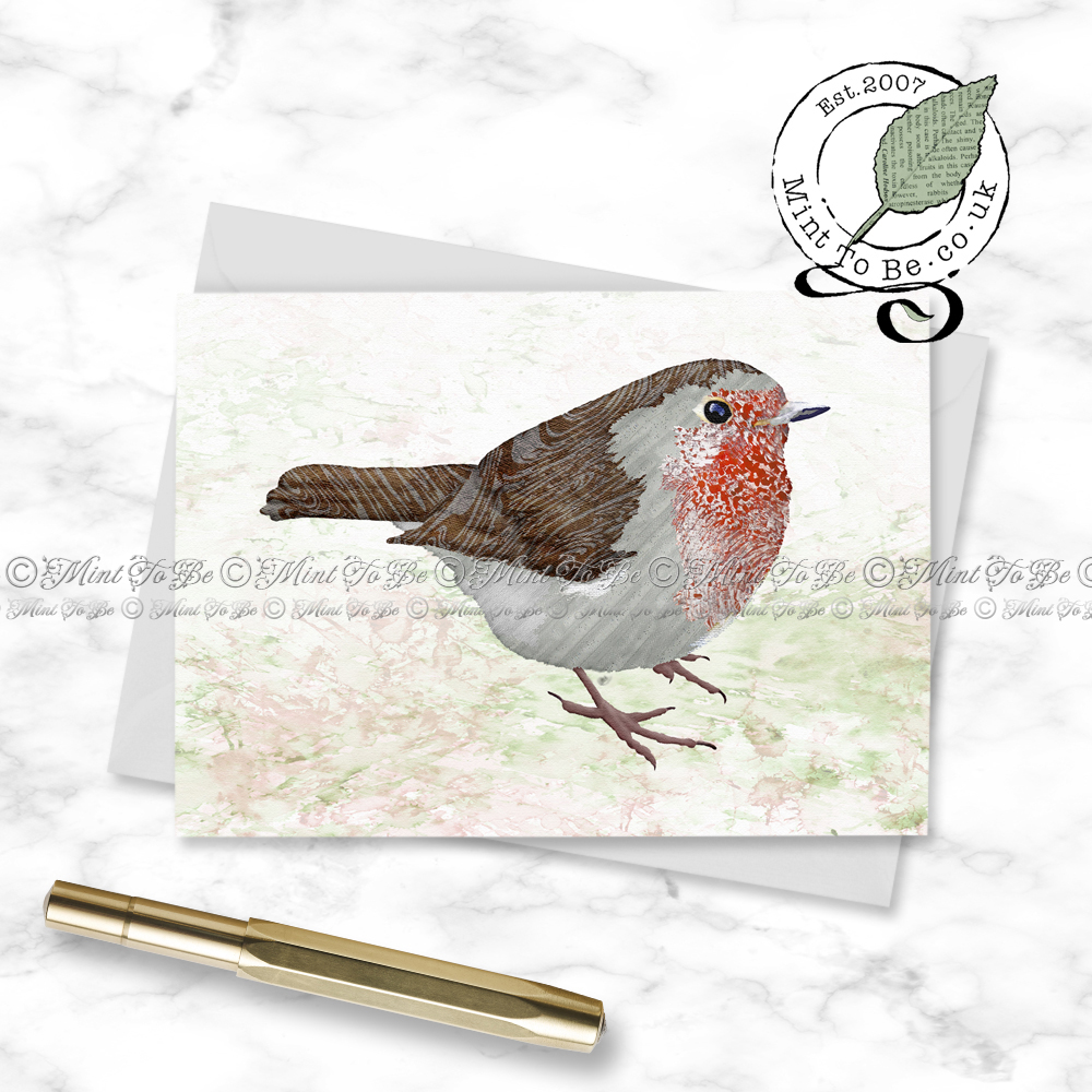 A greetings card created from one of my original recycled and textured inlaid paper marquetry pieces featuring a robin seen in Ireland, although we have robins nesting in our garden too.