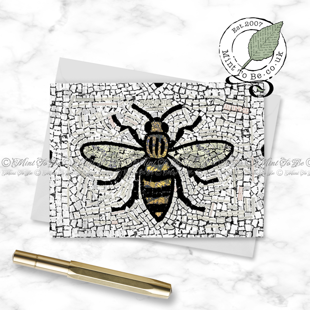 A greetings card created from one of my original mixed media collage pieces featuring the Manchester Bee and based on the worker bee mosaic on the floors of the Manchester town hall. Blank inside for your own message. Inspired from what I see in my garden, on my field work, travels and from life experiences, I work only from photographs that I have taken or sketches that I have made in the field. Each art card is printed in the UK by an FSC (Forest Stewardship Council) certified printing company, with a zero waste to landfill ethos, using responsibly sourced FSC medium to heavyweight smooth board and supplied with an FSC heavyweight white or pearlescent paper envelope.