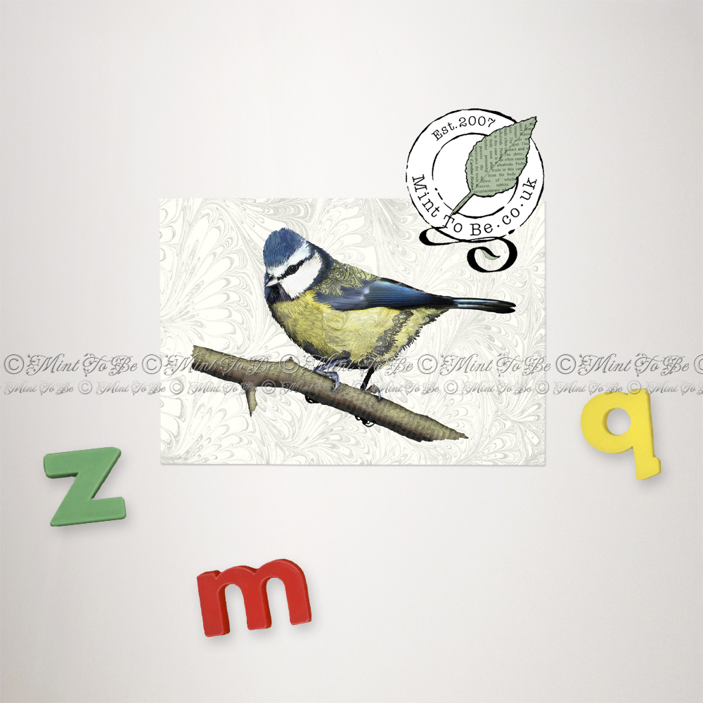Artify your fridge, metal filing cabinets or magnetic notice boards with this slimline, flexible art magnet, reproduced from a miniaturisation of one of my original recycled and textured inlaid paper marquetry pieces featuring Tufty, a blue tit in our garden.
