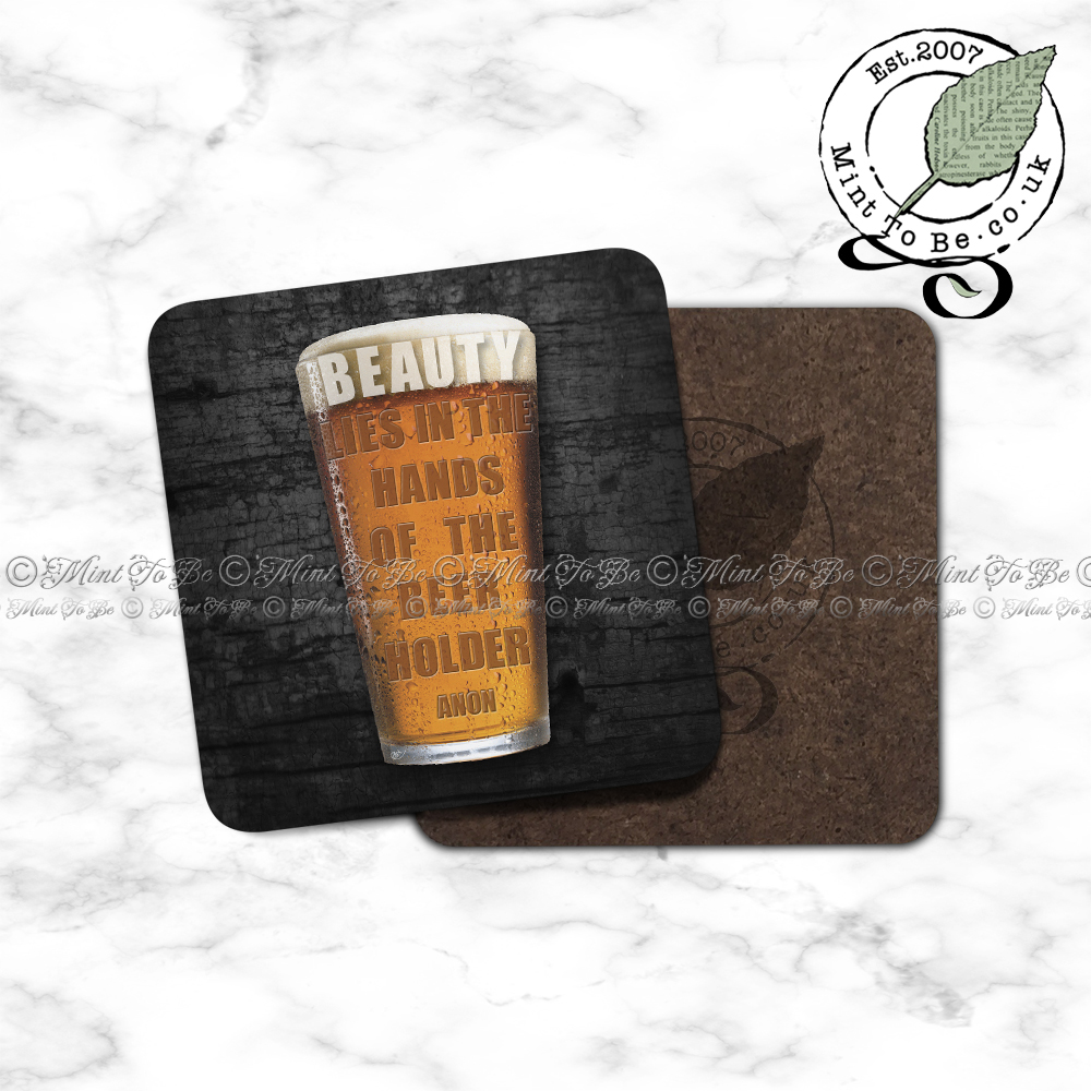 For the beer drinker who needs to up their game from an old cardboard drip mat, I’ve incorporated an old drinking saying and combined it with photographs I’ve taken of an amber beer and a lump of charred, burnt wood in the garden.