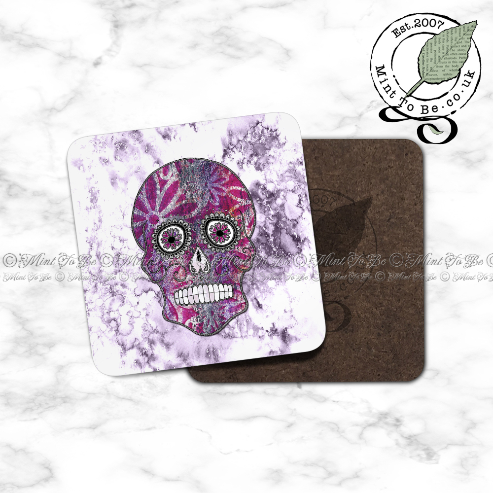 Artify your morning cuppa, workplace brew or evening tipple! This glossy hardboard coaster has been reproduced from one of my original dip pen and ink drawings featuring monoprinting and a sugar skull. This was one of three pieces done in the fourth year of what has now become a collectible annual series.