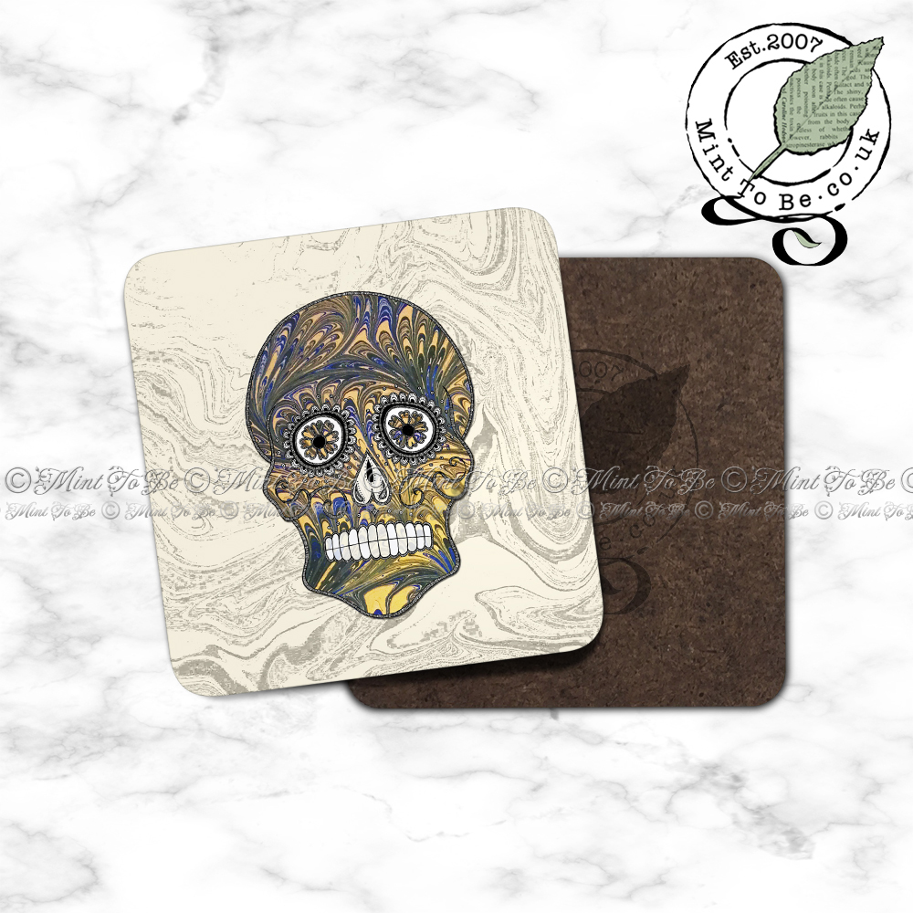 Ideal for: Anyone who loves sugar skulls, Day of the Dead, gothic icons, Mexicana, travel, ink drawings, marbling, collecting coasters, art.