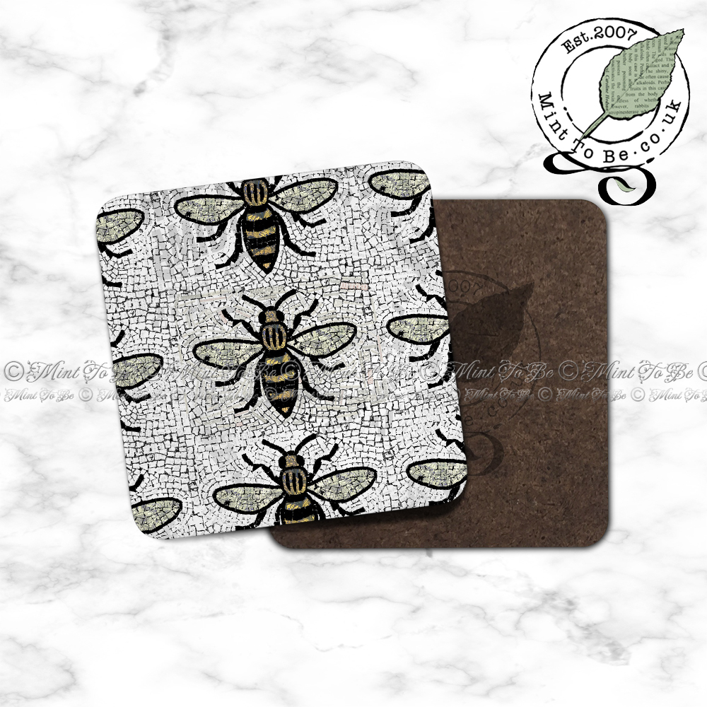 Artify your morning cuppa, workplace brew or evening tipple! This glossy hardboard coaster has been reproduced from one of my original mixed media collage pieces featuring the Manchester Bee and based on the worker bee mosaic on the floors of the Manchester town hall.