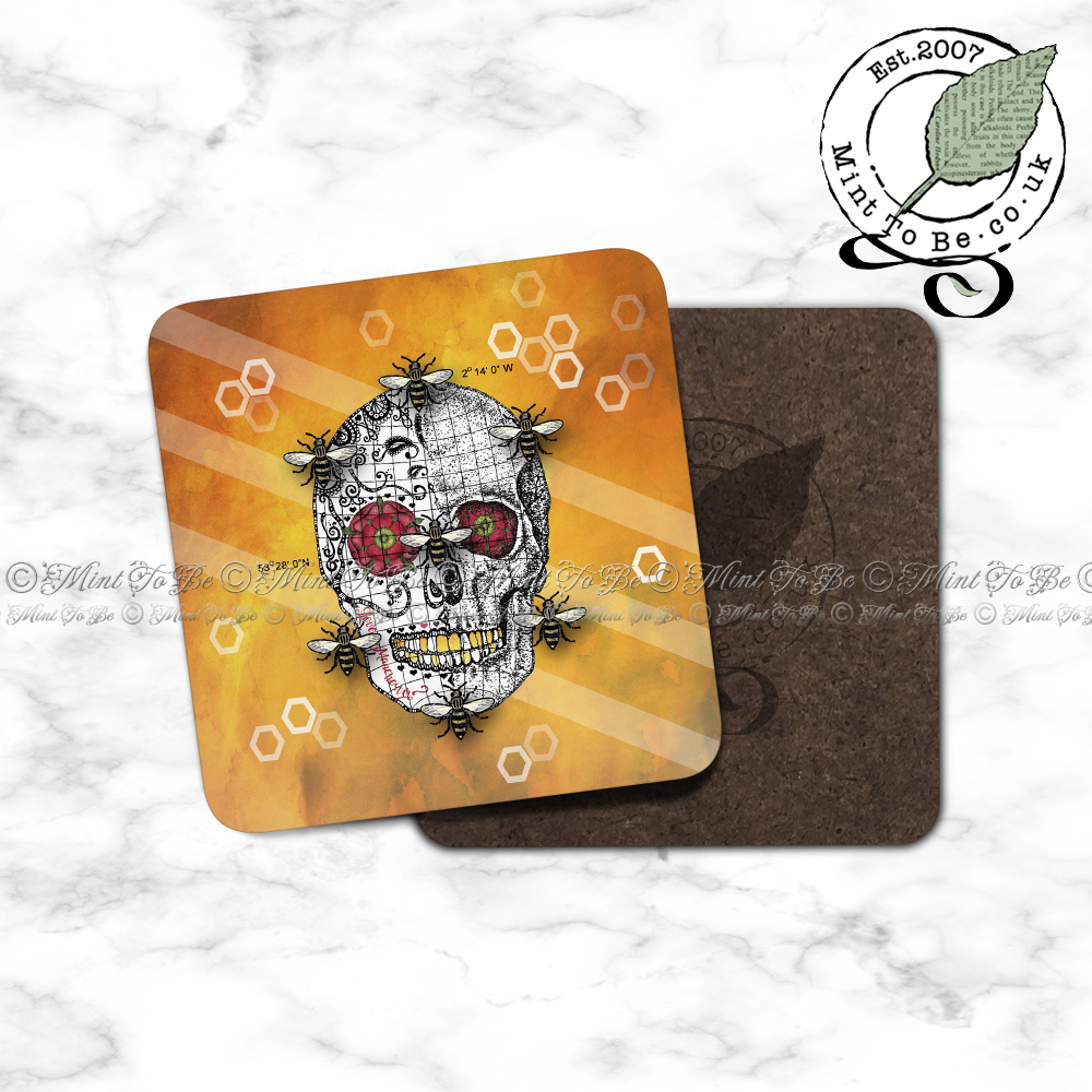 Ideal for: Anyone who loves sugar skulls, Day of the Dead, gothic icons, Mexicana, Manchester, the Manchester Bee, bees, travel, history, all things British, UK, travel, ink drawings, drawings with hidden symbols, collecting coasters, art.