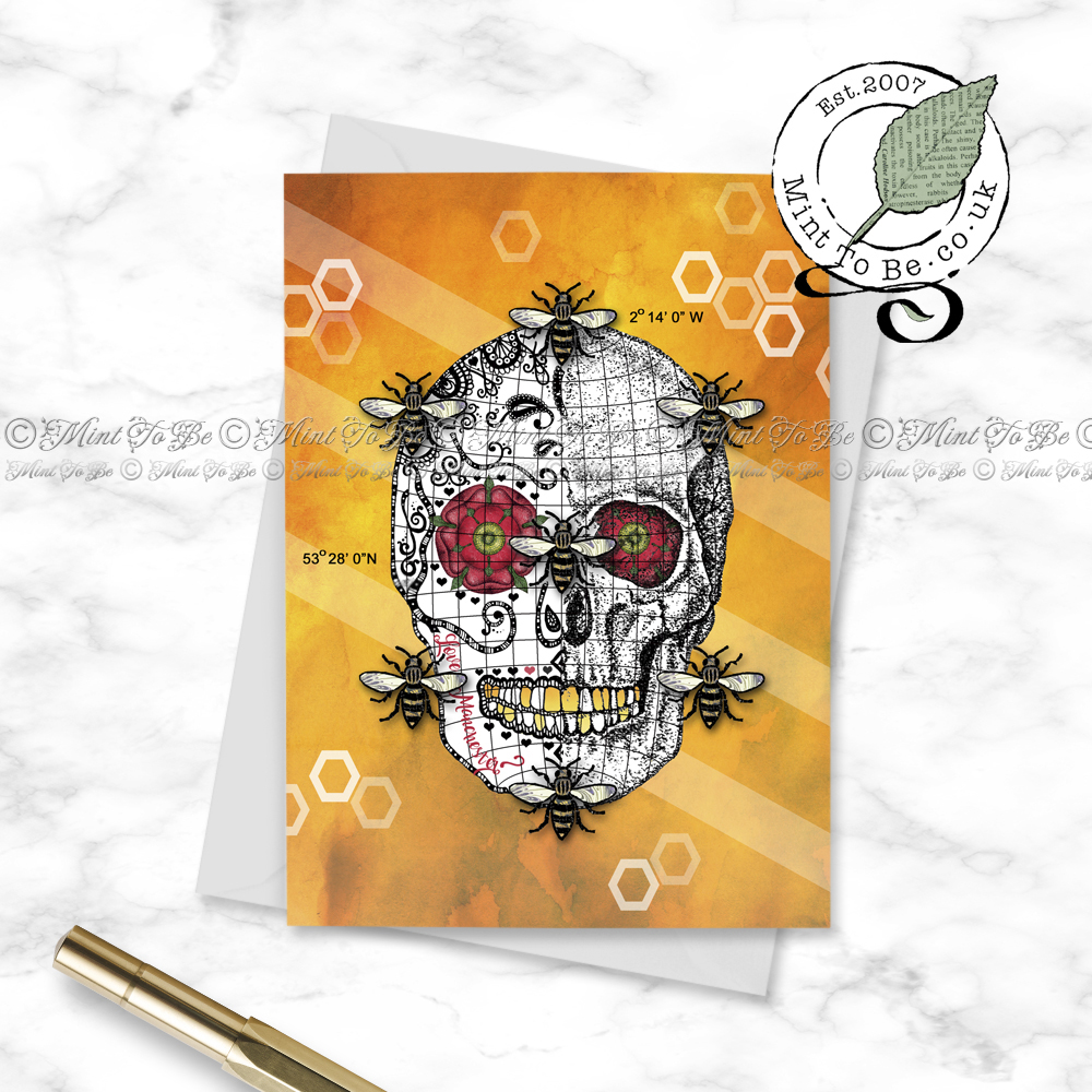 A greetings card created from one of my original dip pen and ink drawings featuring a sugar skull. This was a special Manchester 2017 edition sugar skull, one of three pieces done in the fourth year of what has now become a collectible annual series.