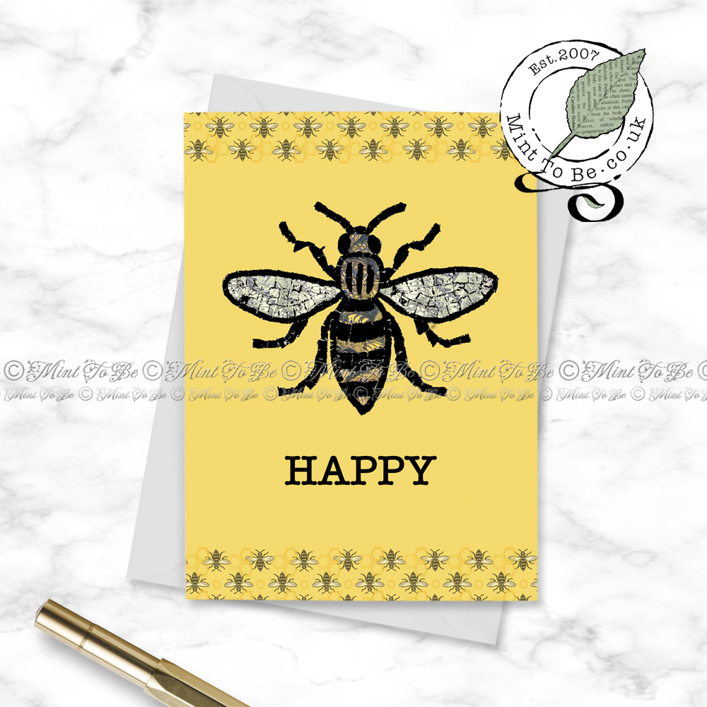 A super cheerful greetings card created from one of my original mixed media collage pieces featuring the Manchester Bee and based on the worker bee mosaic on the floors of the Manchester town hall.