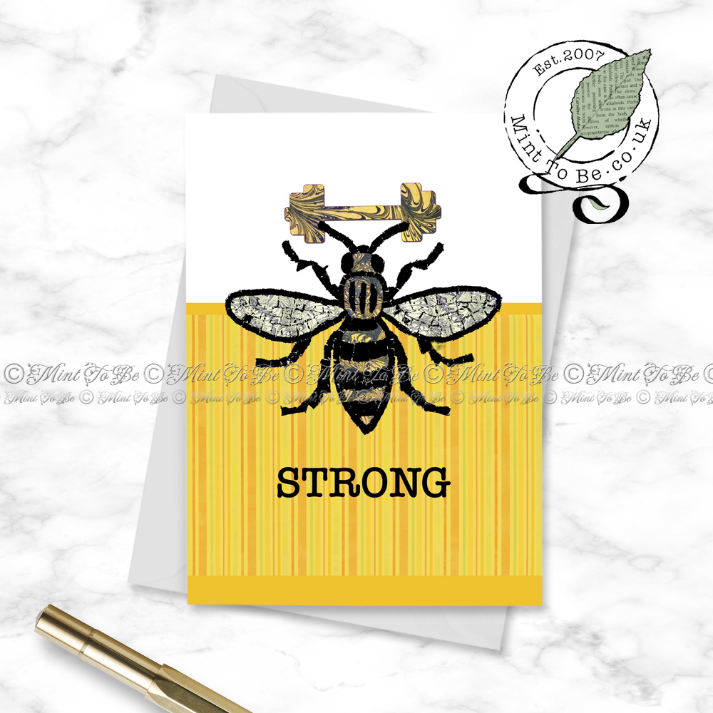 A super positive greetings card created from one of my original mixed media collage pieces featuring the Manchester Bee and based on the worker bee mosaic on the floors of the Manchester town hall.
