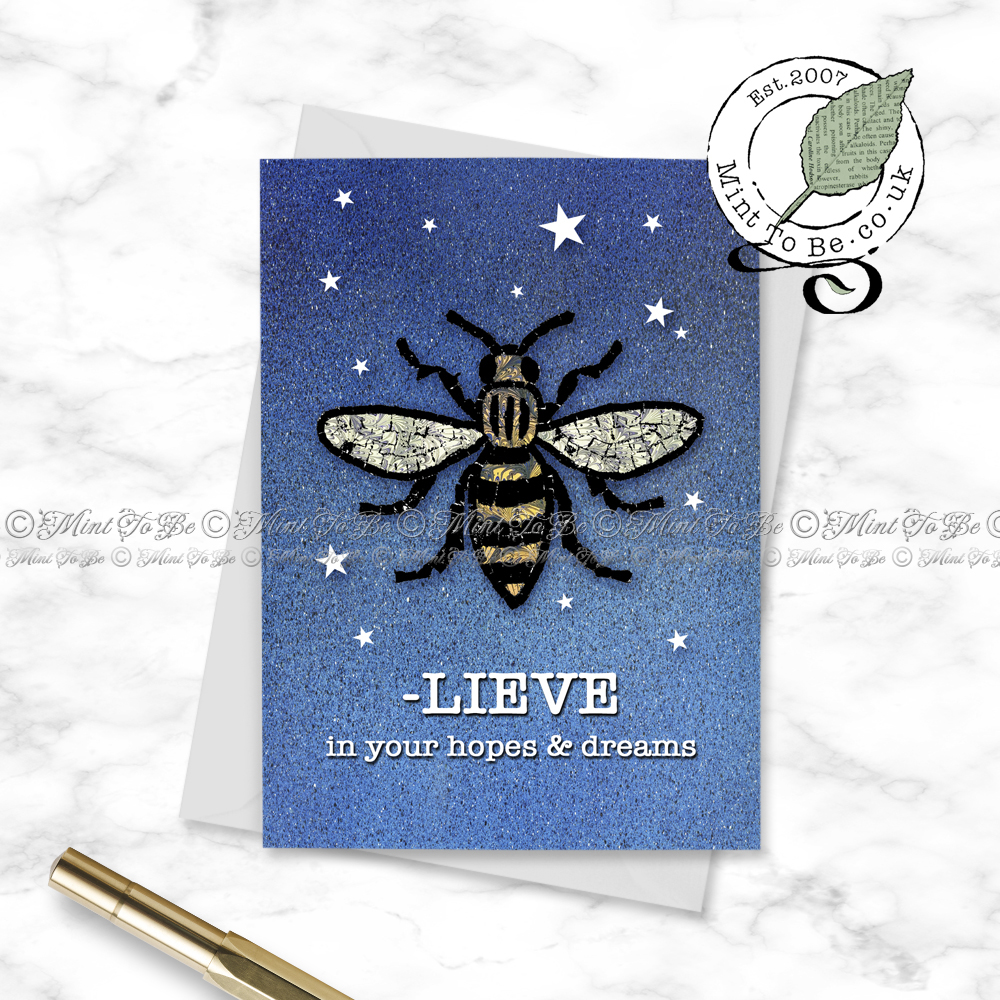I’ve set the bee against a background of mouth-blown, spray diffused deep blue acrylic inks and paper cut stars.