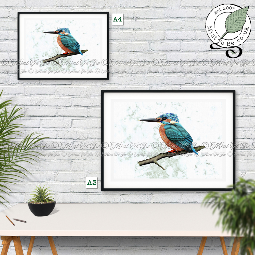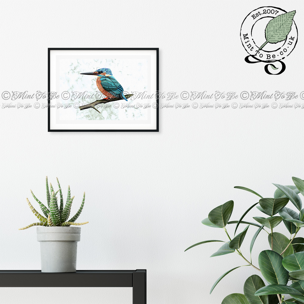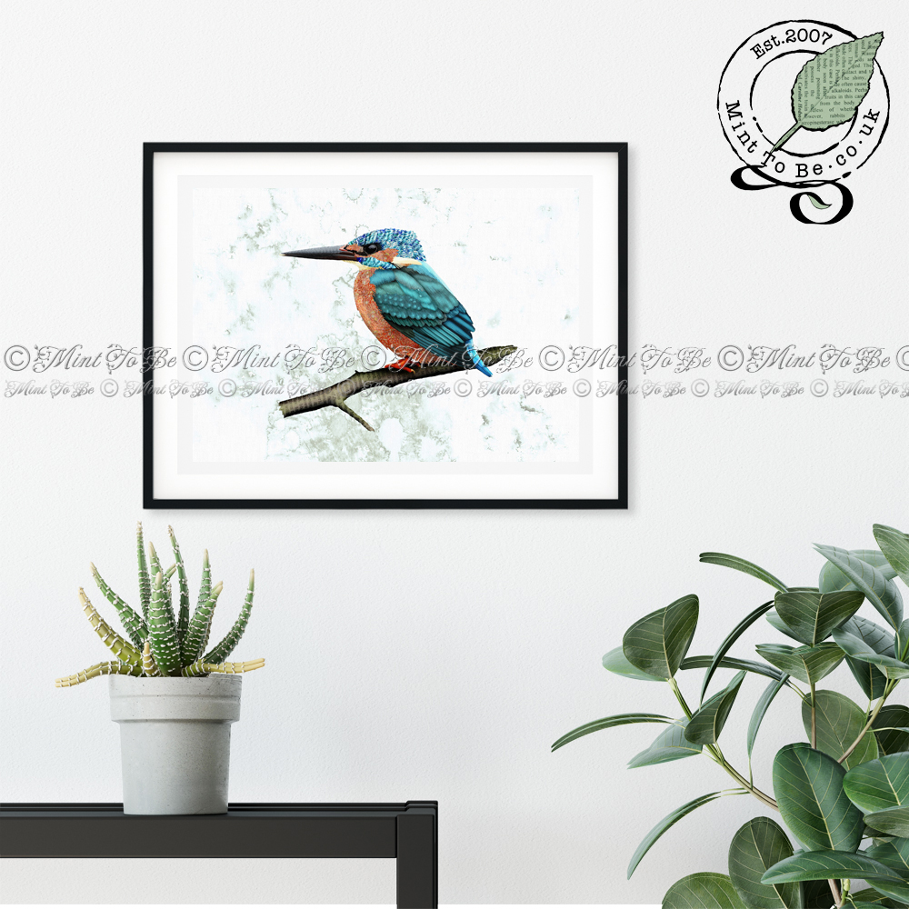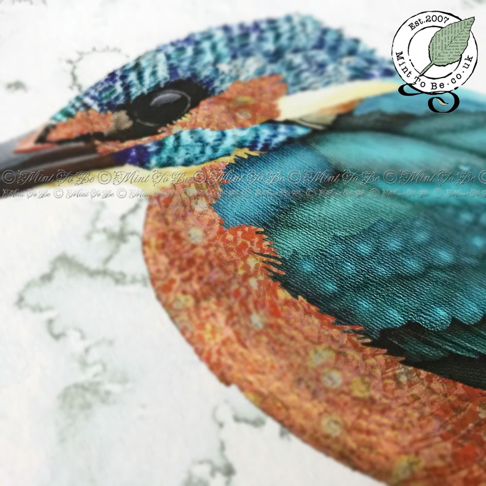 Adorn the walls of your home or office with this striking and detailed paper marquetry kingfisher art print. The original was created using a page from a recycled dictionary along with carefully selected, vividly coloured textured papers, from which many tiny pieces were cut and painstakingly inlaid by hand to give a lifelike impression.