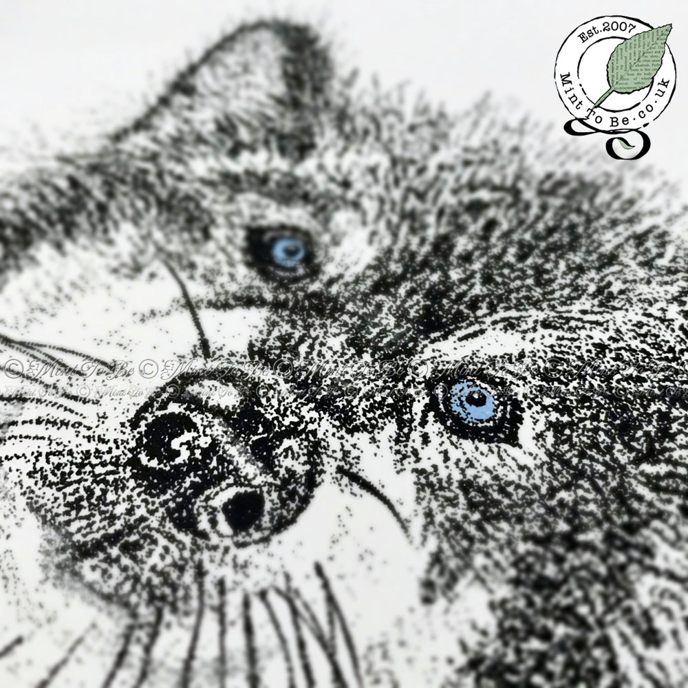 I’ve drawn his face by making thousands of tiny stippled dots of ink with a vintage dip pen inherited from my mum, spacing them out or layering them up to create the depth and texture of the hairs and finally painting in his icy, sky blue eyes with acrylic ink; it was if his eyes mirrored his snow-capped mountain environment.