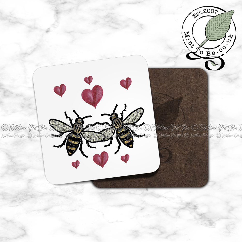 These two bees have found one another and are celebrating their love under a large red, hand painted watercolour heart.