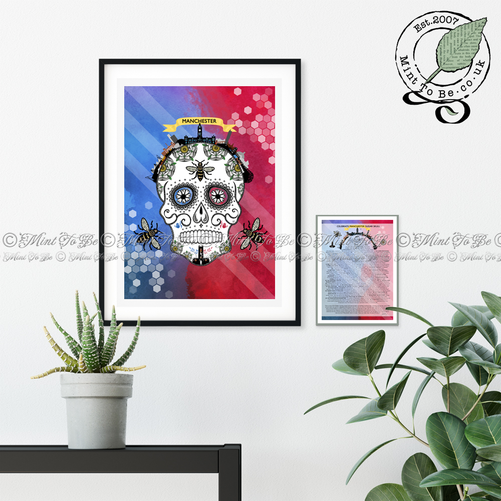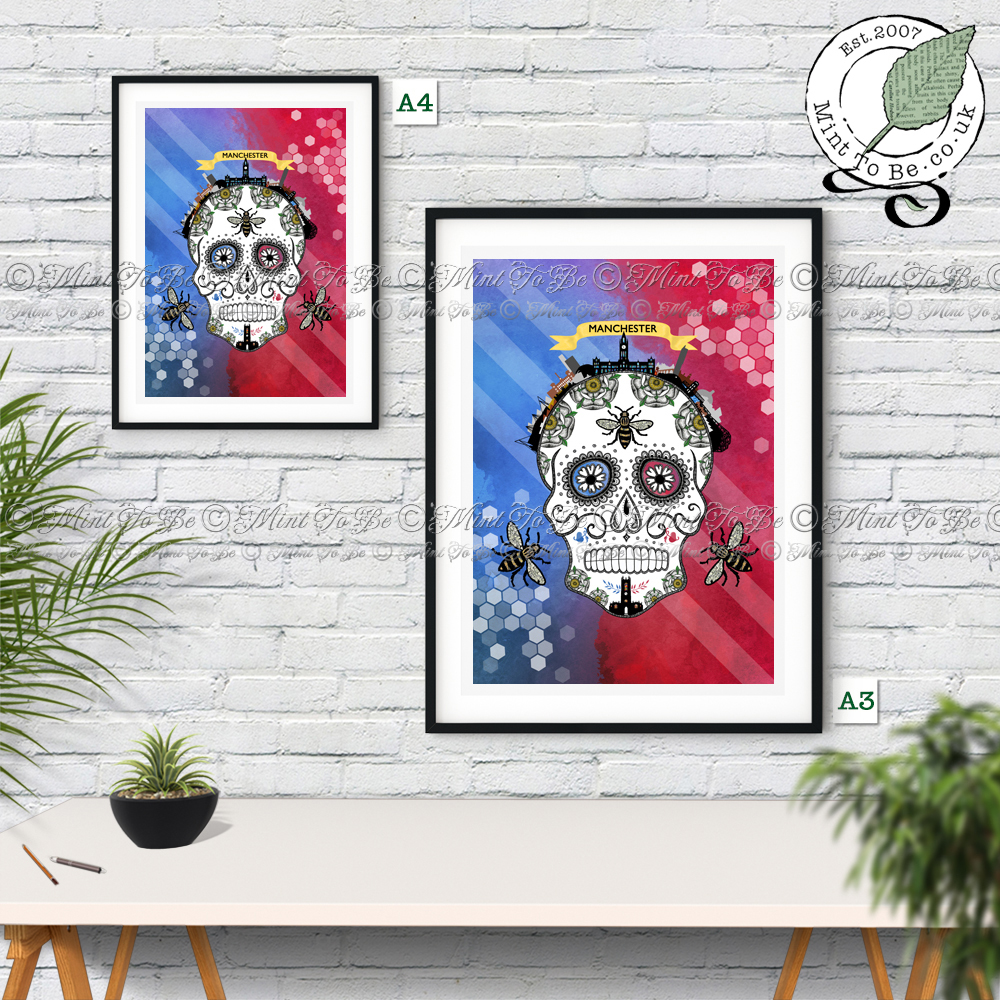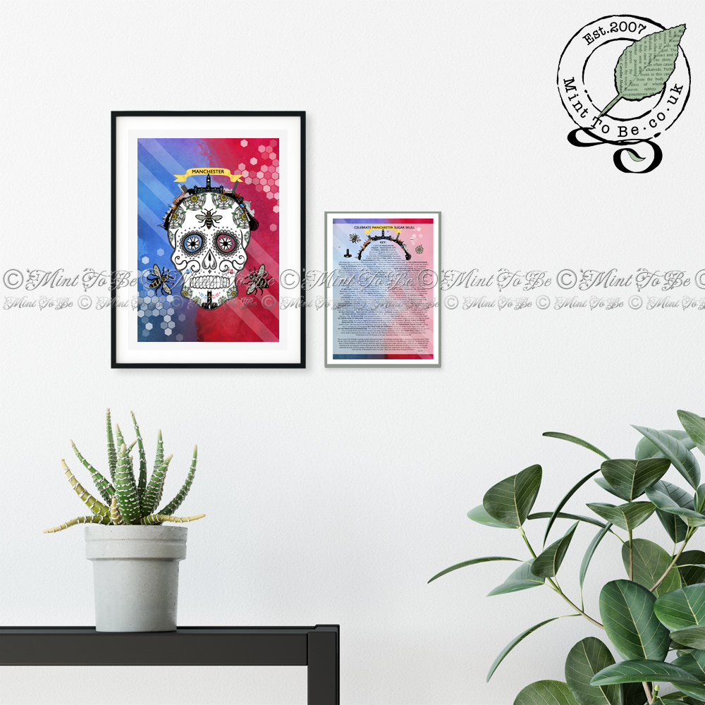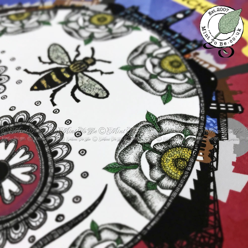 Ideal for: Anyone who loves sugar skulls, Day of the Dead, gothic icons, Mexicana, Manchester, the Manchester Bee, bees, travel, history, all things British, UK, travel, ink drawings, drawings with hidden symbols, landmarks, skylines, Manchester City football, Manchester United football, art.