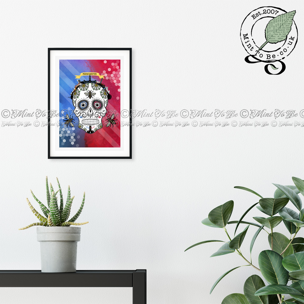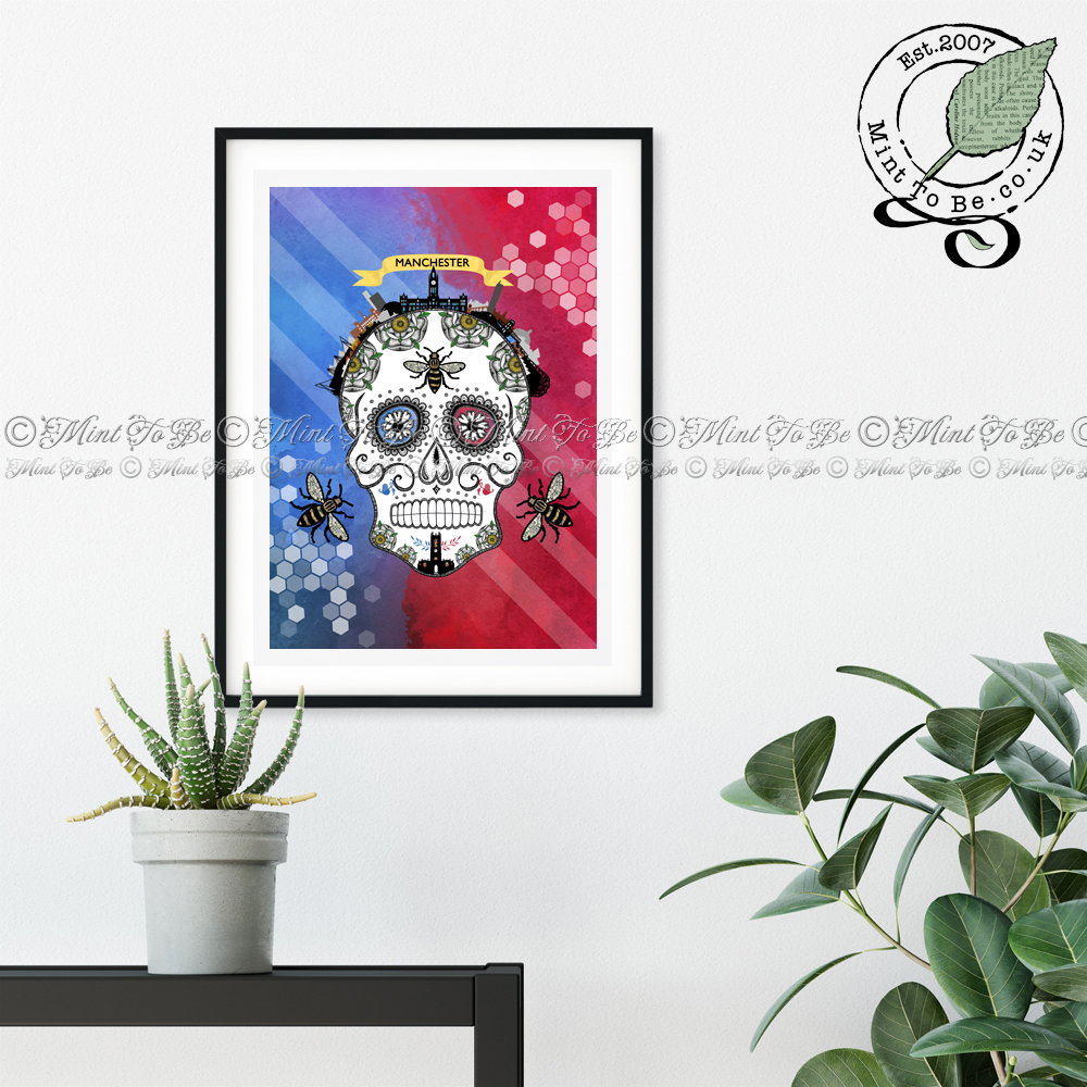 Bring some gothic flair to your home décor with this unusual and highly detailed Celebrate Manchester Sugar Skull art print. Celebrating the great city united, the skull is drawn in dip pen and ink over a background of blue and red. Look closely and you’ll see many hidden motifs, symbols and landmarks, 30 to be precise, so I have created a companion key, which can also be framed, when you purchase this print; it'll make you look a whizz in front of this print's admirers! A firm favourite, this is a piece that is sure to be talked about.