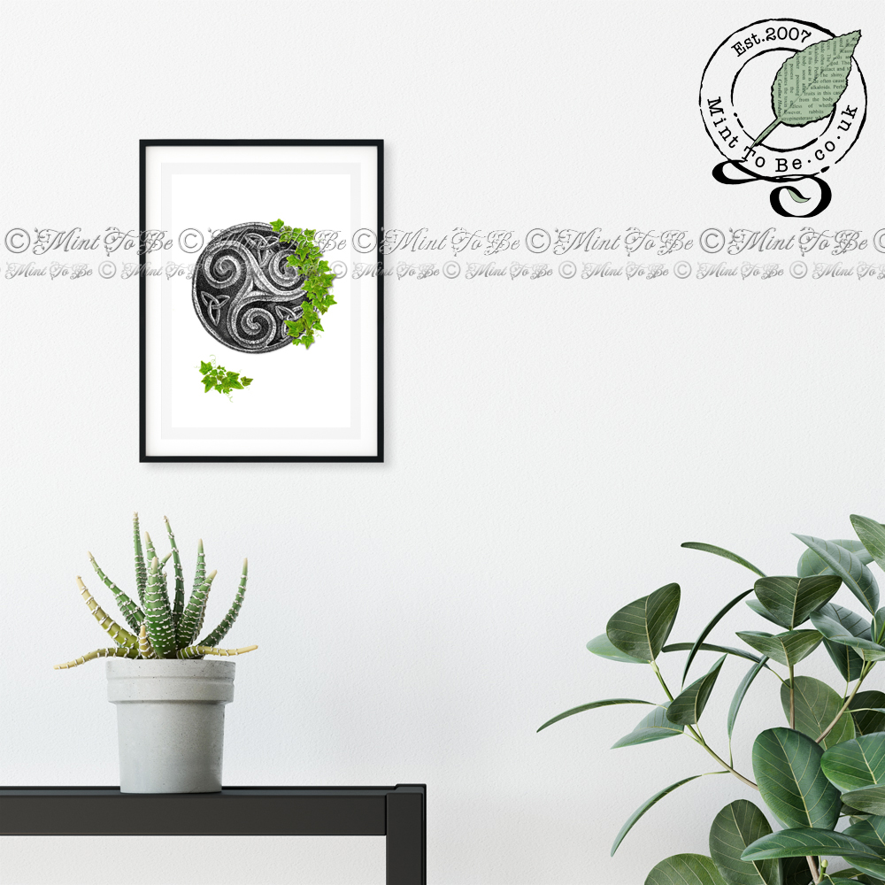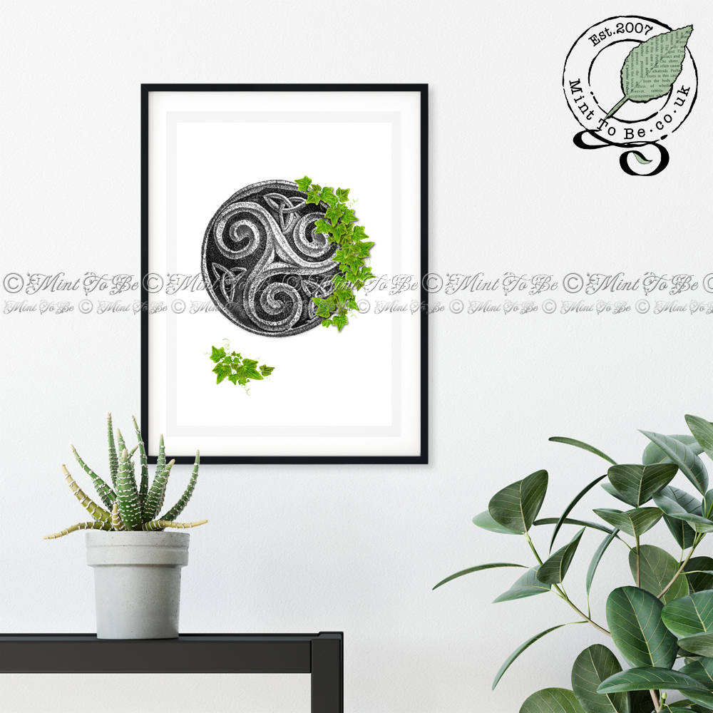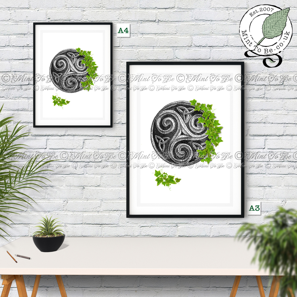 Add a focal point to your room that is sure to be noticed with this striking dip pen and ink, stippled dot drawing of a carved Celtic Triskele and Triquetra (Trinity) knot draped in vivid green watercolour pencil foliage. If you look closely, you'll see that the cross has originally been drawn entirely in stippled dots of ink, using a vintage nib pen.