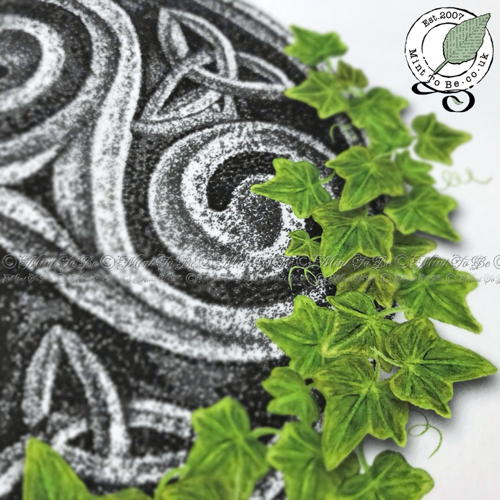 I created the original drawing using my vintage dip pen inherited from my mum, with which I drew thousands of tiny acrylic ink dots, spaced out or layered up to create the depth of the intertwining knot work and, since foliage often creeps around carved stonework, I’ve added vibrant, watercolour pencil variegated green ivy.