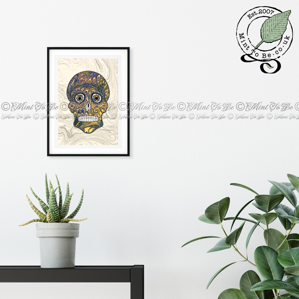 Bring a little gothic flair to your home décor with this delicately marbled sugar skull art print.